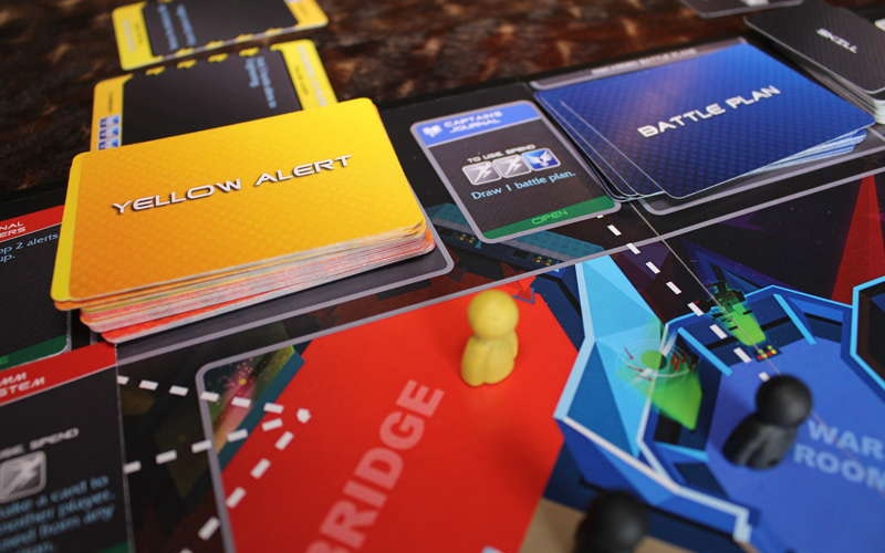 The game begins in the middle of the story. Up to seven players find themselves aboard a starship, adrift in space and besieged within and without by hostile aliens. The Captain is Dead is a cooperative game, in which players win or lose by working together against the game itself. Known for thematic drama and mounting tension, co-op games demand strong teamwork. In The Captain is Dead, the board represents a classic starship interior, with all the familiar spaces and systems: the bridge, sick bay, engineering, photon torpedoes and the transporter. The crew has one mission: repair the damaged Jump Core. An intensifying series of alerts knock out vital systems, release obstructive anomalies, injure crew members, insert hostile aliens and damage the shields. As the title indicates, the ship’s captain has been written out of the story, leaving behind archetypes such as the First Officer, Engineer and Ship’s Doctor, as well as a handful of quirkier roles, such as the resourceful Janitor, expendable Crewman and implacable Hologram.